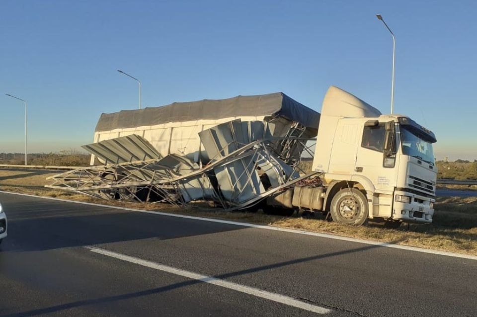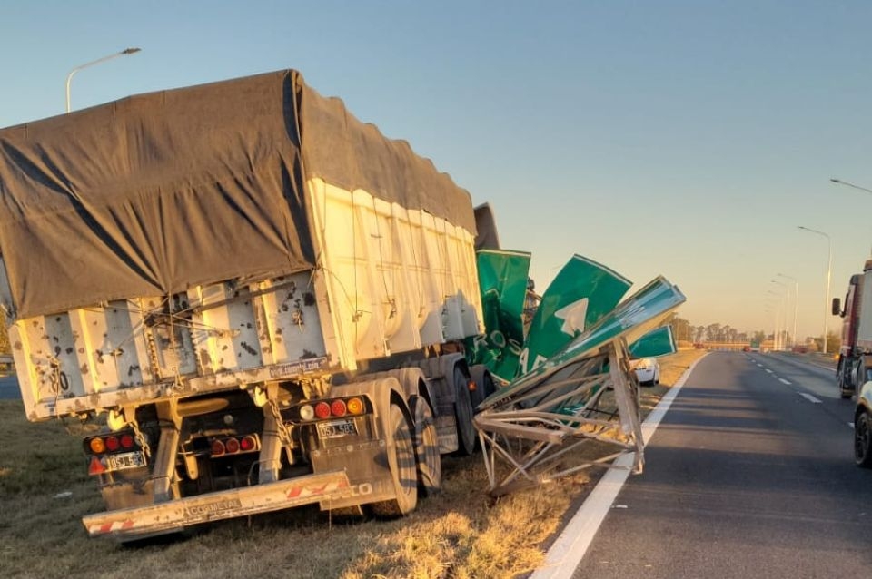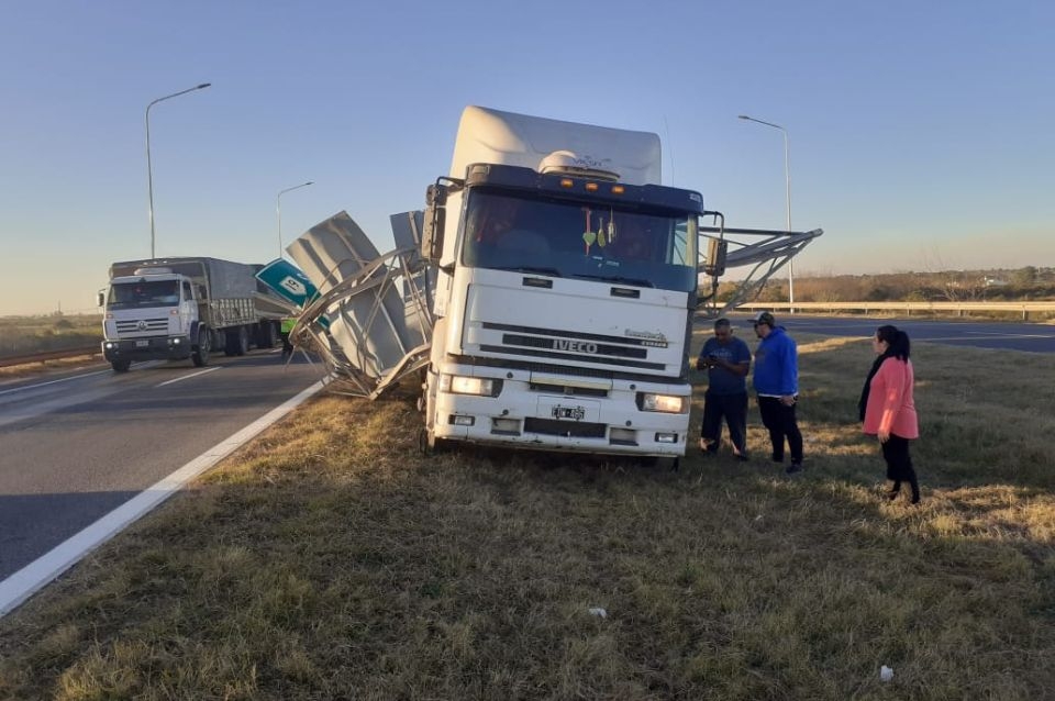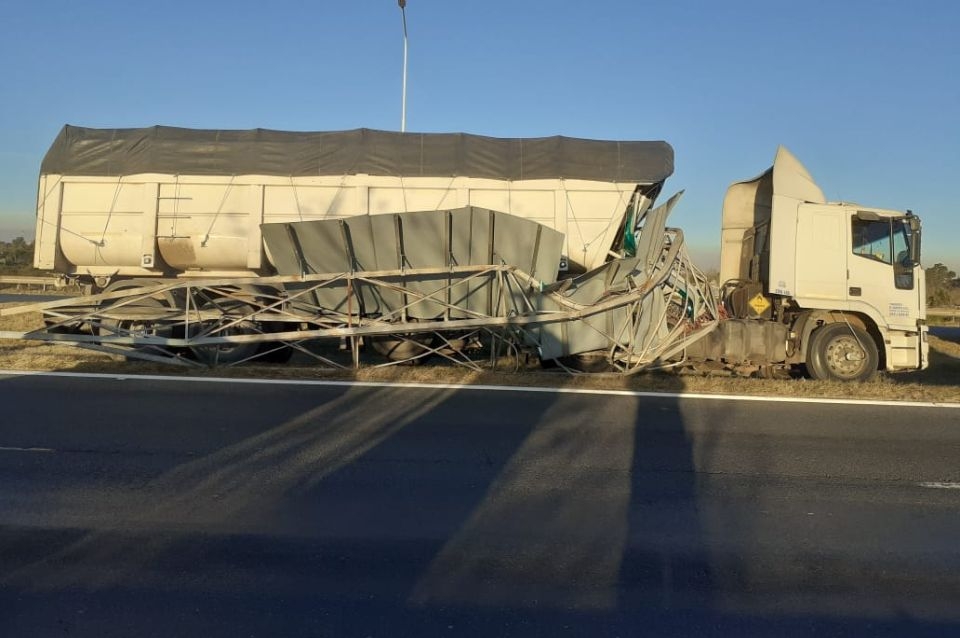 De esta forma, queda en el cantero central de la Autopista con parte del cartel incrustado entre la cabina y el acoplado.