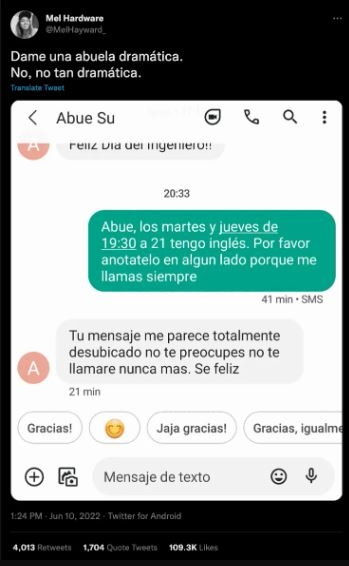 Al recibir reiteradas llamadas de su abuela mientras se encontraba en clase de inglés, Mel se vio obligada a aclararle a la mujer, una vez más, que no la llame más en ese horario. Sin embargo, la respuesta de su abuela no fue la que se esperaba, y aprovechó la situación para cosechar algunos "likes" en Twitter.