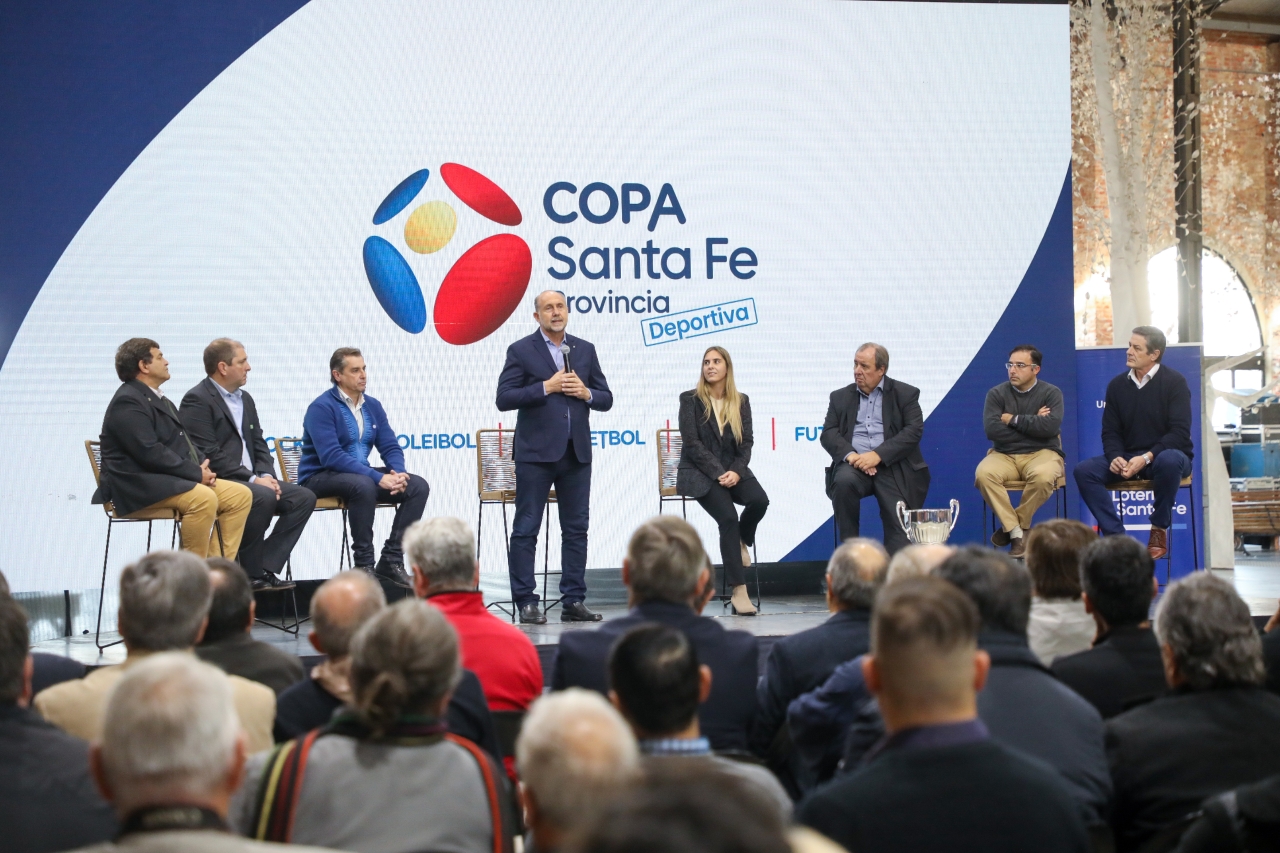 El gobernador Omar Perotti participó este jueves en La Redonda de la presentación de las Copas Santa Fe Provincia Deportiva - Edición 2022, junto a las federaciones y asociaciones deportivas en la capital santafesina. La propuesta, que incluirá instituciones de todo el territorio santafesino, tendrá torneos de fútbol, básquetbol, vóleibol, hockey y rugby, en las ramas masculina y femenina.