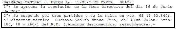 Esto viene del triunfo ante Barracas Central de la 3ª fecha de la Liga Profesional, donde el árbitro Andrés Merlos elevó un fuerte informe tras los dichos del conductor rojiblanco. El argumento que se expuso en la resolución fue por "términos desmedidos" y por ser algo "reincidente".