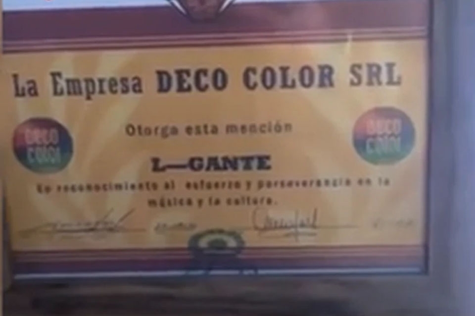 “La empresa Deco Color SRL otorga esta mención a L-Gante en reconocimiento al esfuerzo y perseverancia en la música y la cultura”, dice el premio que L-Gante tiene a la vista sobre un mueble de su hogar.