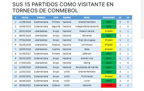 El entrenador Gustavo Munúa perdió su impresionante racha como entrenador en condición de visitante en torneos CONMEBOL: Nunca había sido derrotado en los 14 partidos que llevaba dirigidos (9 victorias y 5 empates), 6 en Sudamericana y 8 en Libertadores.