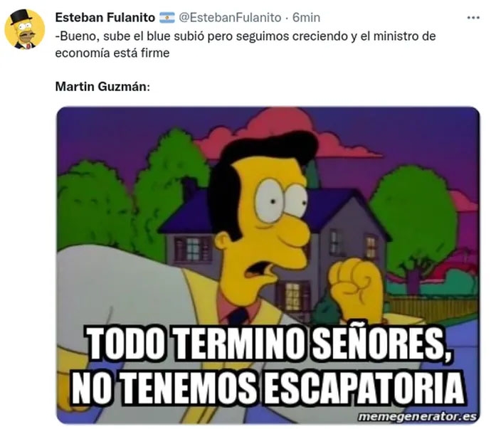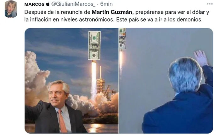 Tras meses de conflictos internos y luego de una semana en donde el aumento del dólar preocupó a la mayoría de los argentinos, Martín Guzmán tomó la decisión de renunciar a su puesto de Ministro de Economía. El anuncio llegó a través de un tuit, el cual publicó al mismo tiempo que Cristina Fernández de Kirchner pronunciaba un discurso en Ensenada. Apenas unos segundos después, el nombre del exfuncionario ocupaba lo más alto de las tendencias de la red del pajarito, en donde entre quejas y críticas, se destacaron una gran cantidad de memes.