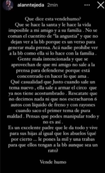 "Pensás que podés manipular todo y no es así. Es un excelente padre que le da todo y vive para sus hijas al igual que los abuelos, que por cierto les ponés mil y un trabas para que ellos tengan a la bebé aunque sea un rato", cerró el amigo de Paulo Londra defendiendo al cantante.