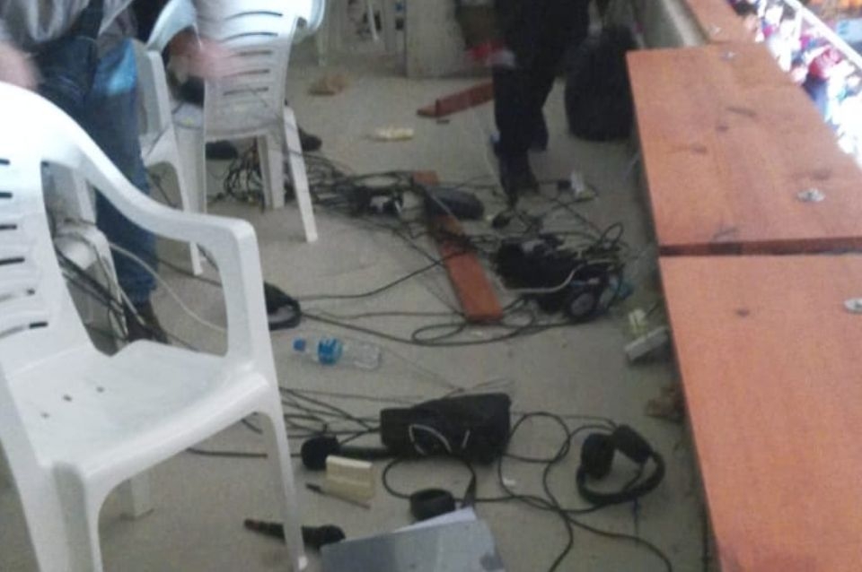 Una imagen dejó al descubierto como quedo el espacio, con equipos electrónicos de transmisión esparcidos por el piso y cables cortados.