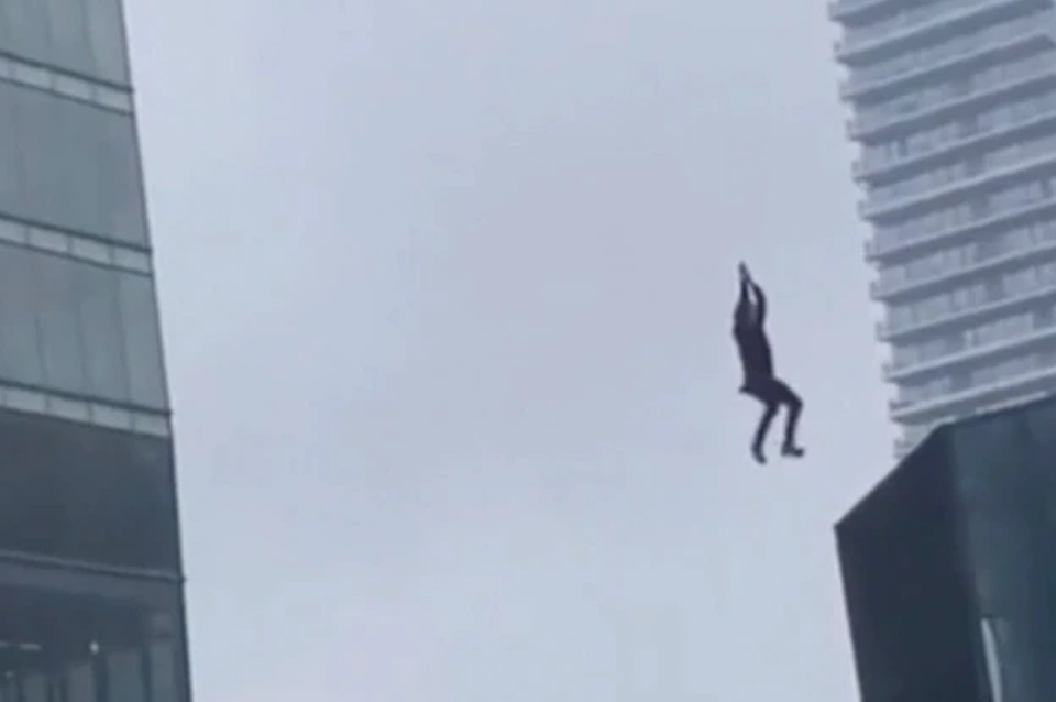 Las imágenes del trabajador aferrándose al cable con el vacío bajo sus pies son aterrorizantes. También se pueden escuchar los gritos desesperados de los testigos de la situación. El peligro de la situación se hace mucho más obvio y palpable cuando el casco de seguridad del obrero cayó de su cabeza al vacío.