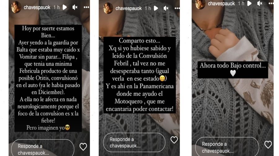 Sobre las consecuencias en la salud de Filipa que le preocupaban, Paula expresó: “¡A ella no le afecta en nada neurológicamente porque el foco de la convulsión es por la fiebre!”. Y reflexionó: “Comparto esto porque si yo hubiese sabido y leído de la convulsión febril, tal vez no me desesperaba tanto. Y es ahí, en la Panamericana, donde me ayudó el motoquero que me encantaría contactar!”.