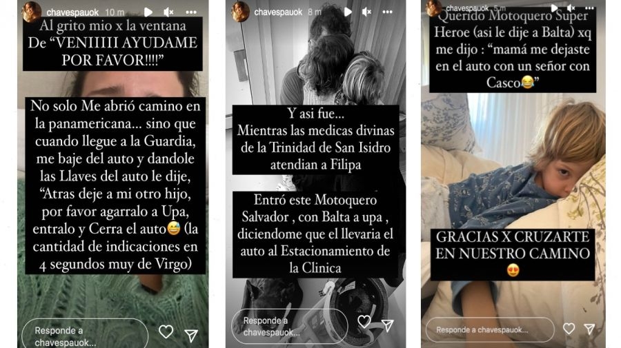 Paula contó la anécdota con la intención de poder contactarse con el hombre y poder agradecerle por todo lo que hizo por su familia en ese momento de crisis: “Y así fue… Mientras las médicas divinas de la Trinidad de San Isidro atendían a Filipa. Entró este motoquero salvador, con Balta a upa, diciéndome que él llevaría el auto al estacionamiento de la clínica”.