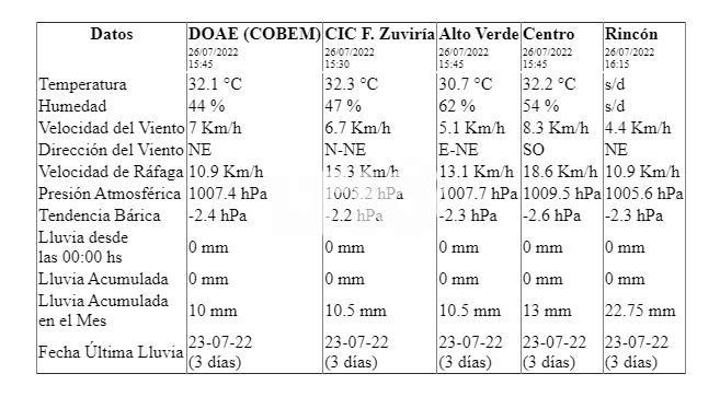Así, entre las 15:30 y las 15:45, tres de los cuatro termómetros que tiene instalada la Municipalidad en distintos puntos de la ciudad registraron más de 32°C: el del centro, el de la terminal de ómnibus y el del CIC de Facundo Zuviría al 8000. El cuarto está ubicado en Alto Verde, y midió 30,7°C.
