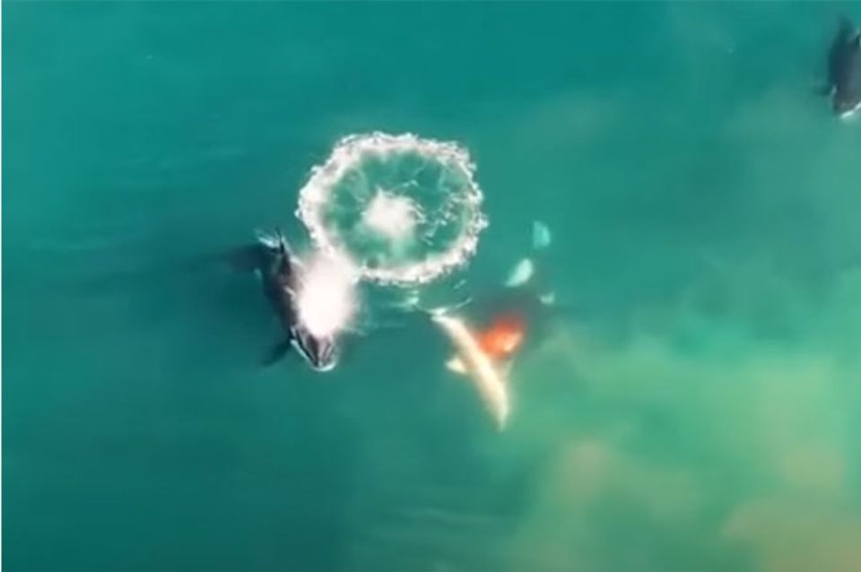 Una escena impactante se difundió por estas horas en redes sociales. En ella se ve a una orca que integraba un grupo de ataque junto a otras dos arrancando brutalmente el hígado de un gran tiburón blanco de cinco metros de largo, mientras las otras dos observan cómo las aguas que alguna vez fueron azules de Mossel Bay, en Sudáfrica, se vuelven rojas por la sangre antes de que el tiburón se hunda en el fondo del mar.