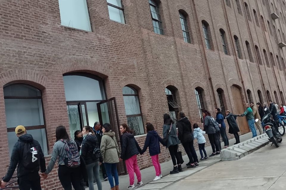 Pese a la tarde desapacible en la ciudad de Santa Fe, alumnos y docentes que concurren a los distintos ámbitos de estudios en el Molino Marconetti realizaron un abrazo simbólico al edificio.