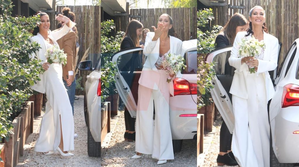 La novia se mostró muy emocionada durante la boda y posó sonriente para la prensa que esperaba sus declaraciones. Vestida íntegramente de blanco, optó por llevar un outfit en tendencia: la sastrería con corpiño debajo.