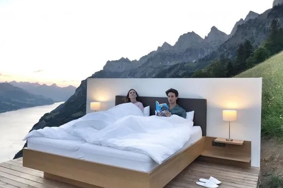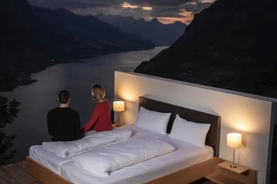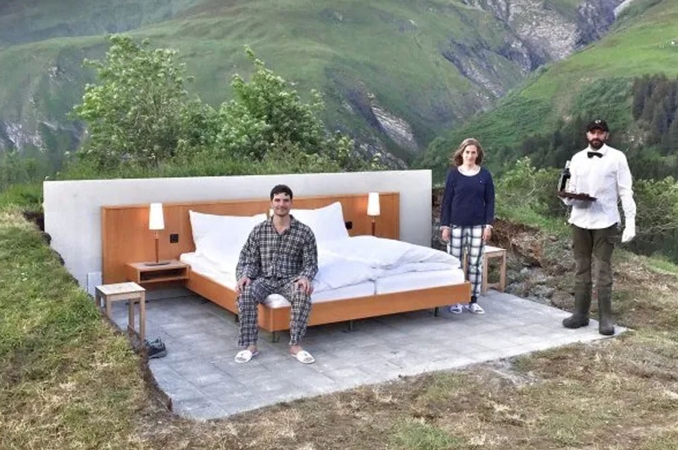 Los hermanos Frank y Patrik Riklin decidieron modernizar el concepto de un alojamiento que no cuenta con paredes ni techo, solo de una cama doble con dos mesas de noche, en el valle de Safien, en Suiza.