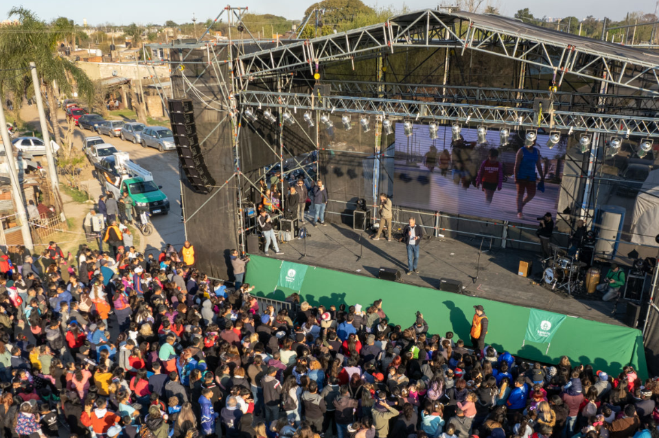En cada bocacalle, había fotos del antes de la obra. La comparación entre el antes y el después eran contundentes. Caminando hacia el escenario, sorprendía un grupo de “paisanos y paisanas” bailando chacareras y, unos pasos más allá, pibes y pibas demostraban los aprendido en las clases de artes marciales. Los tambores anunciaban la llegada de la comparsa Son Bahía y teloneando, en el escenario, sonaba De Las Chapas Crew. Tampoco faltaron los puestos de emprendedores.