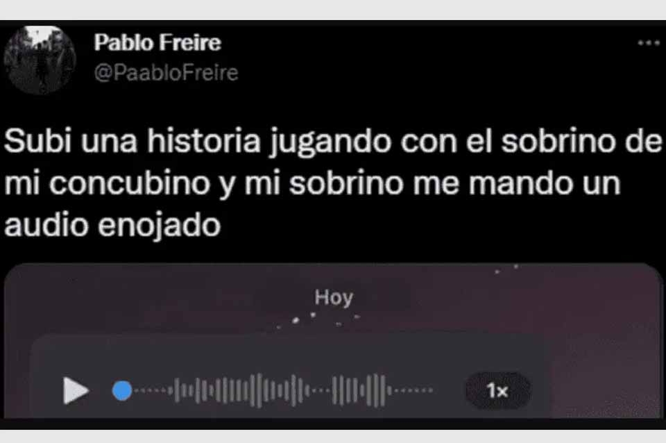 "Subí una historia jugando con el sobrino de mi concubino y mi sobrino me mandó un audio enojado", expresó Pablo en el tuit. Además, sumó una grabación de pantalla de un chat donde se lo escucha al nene, la cual ya tiene 1 millón de reproducciones.