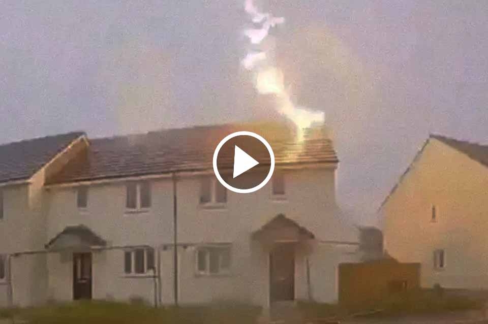 Bomberos del condado británico de Cornualles publicaron un increíble video que muestra el momento en que un rayo cae sobre una casa de reciente construcción, situada en una nueva urbanización.