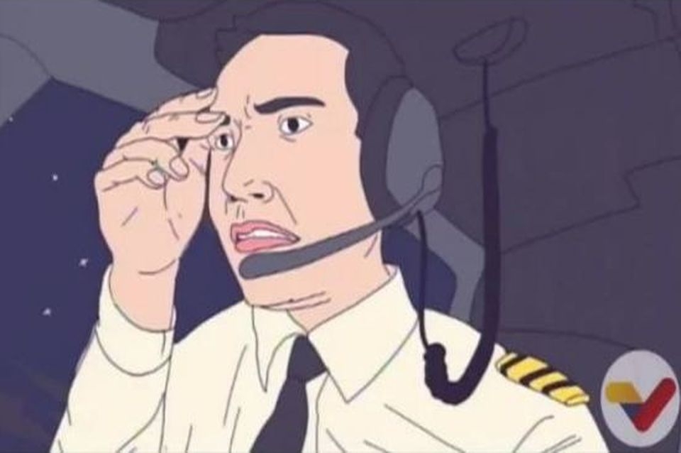 Como parte de la animación se puede ver al dibujo de una mujer haciéndose la señal de la cruz mientras se escucha en voz en off: “les habla su capitán: les informamos que no nos dejan aterrizar en Montevideo para abastecer combustible. Debemos regresar a Buenos Aires, permanezcan en sus asientos”.