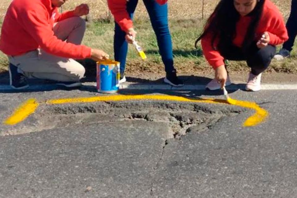 Debido al mal estado de la Ruta Nacional 11, un grupo de jóvenes tuvo la iniciativa de señalizar los baches de ese corredor.