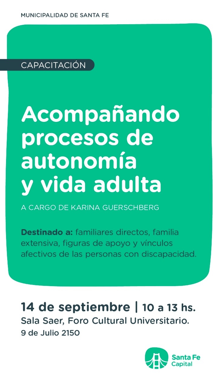 La Municipalidad de Santa Fe invita a la jornada "Acompañando Procesos de Autonomía y Vida Adulta". Es un trabajo que se da en el marco de la implementación del Proyecto sobre Figuras de Apoyo y Autonomía a través de la Subdirección de Accesibilidad y Derechos para Personas con Discapacidad.