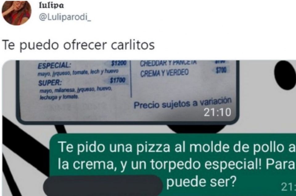 “Te pido una pizza al molde de pollo a la crema y un torpedo especial, ¿puede ser?”, le preguntó la usuaria @Luliparodi_.