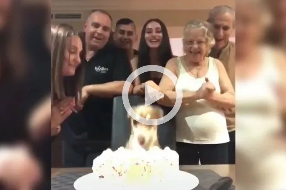 Se puede observar a la mascota con frente a su torta, mientras toda su familia a su alrededor canta happy birthday to you versión canina.