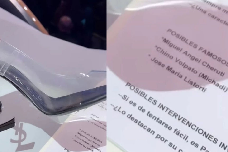 En la hoja que tenía sobre su escritorio en el ciclo que conduce Natalia Oreiro se llegan a leer las pistar que reciben los "investigadores" -Wanda, Roberto Moldavsky, Lizy Tagliani y Karina La Princesita- antes de la presentación de cada participante y las posibles intervenciones que pueden hacer. Pero lo más llamativo es que la producción les da una lista de los famosos que pueden llegar a estar detrás de los disfraces.