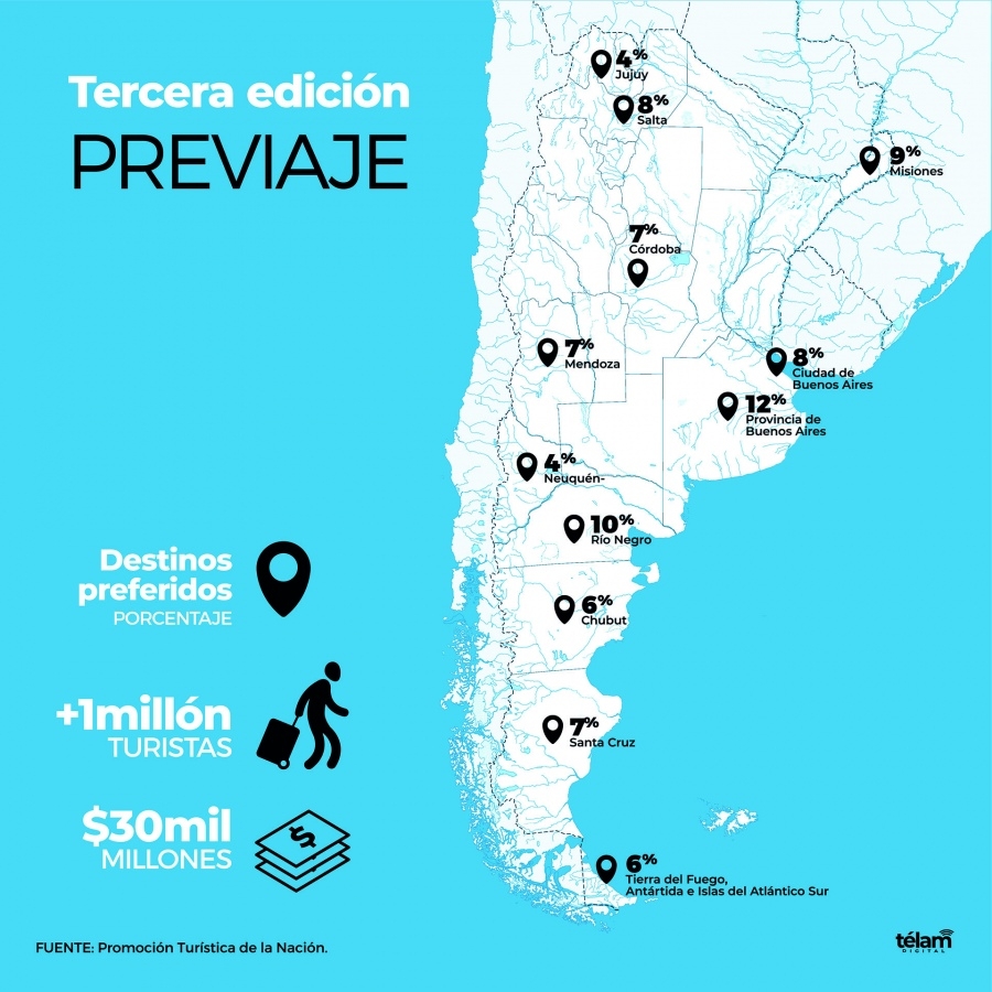 Finalizó la inscripción para la tercera edición del Previaje y desde la Cámara Argentina de Turismo indicaron que no solo superó las expectativas sino que también generará beneficios para las provincias. En tanto un comunicado de la entidad señaló que"un millón de turistas generarán unos $35 mil millones en plena temporada baja" y apunta que "en total Previaje ya benefició a seis millones de turistas con un impacto económico de 200.000 millones de pesos".