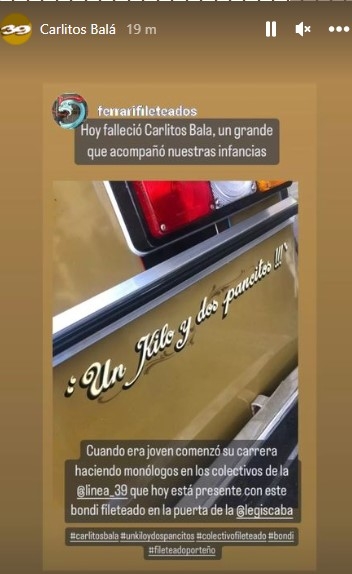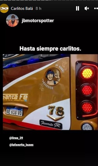 Otro de los sentidos mensajes fue el de la línea 39 de colectivos, que le dedicó un posteo en Instagram por el valor simbólico de su pasajero ilustre: “Con mucha tristeza despedimos a Carlitos Balá, nuestro pasajero más famoso, quien inició su carrera en nuestros colectivos. ¡Hasta siempre Carlitos!”.