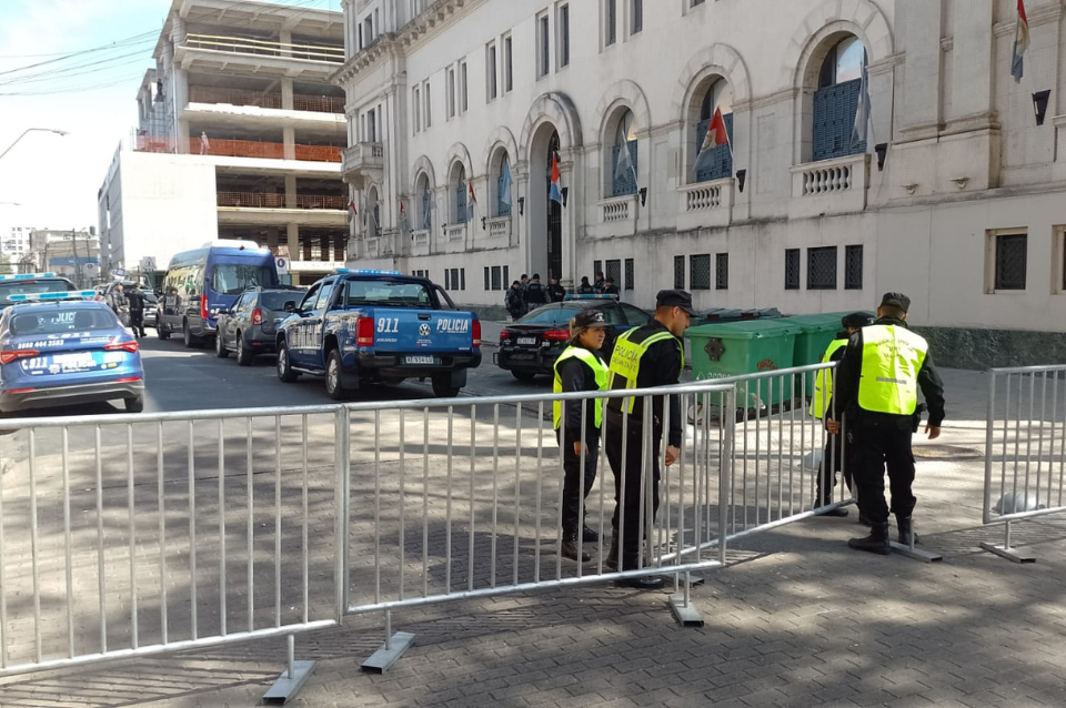 Debido a las audiencias estaba cortada la calle 3 de Febrero entre San Jerónimo y 9 de Julio, debido a que por esa puerta ingresaban y salían los imputados. Hay un gran despliegue de personal policial y fuerzas de operaciones tácticas.