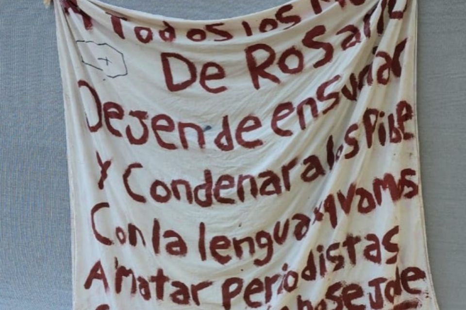“A todos los medios de Rosario, dejen de ensuciar y condenar a los pibes con la lengua xq vamos a matar periodistas. Con la mafia no se jode. Si no caravana con el Noba”, reza la amenaza que fue escrita en la tela y que aparece unos días después de que un abogado publicara en la red social Twitter: "Todos los días hay que ejecutar a un periodista".