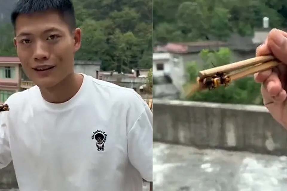 El influencer chino Wang Chan quiso ponerse a prueba y comer con dos palillos una avispa de gran tamaño que estaba muy viva. Después de dudar un poco, tomó el impulso y se la metió a la boca.