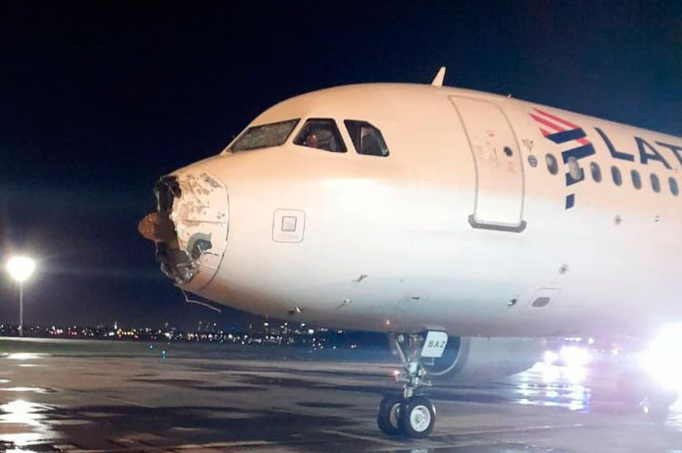 Un vuelo de la compañía aérea Latam que cubría la ruta entre Santiago de Chile y Asunción vivió momentos de tensión al atravesar una severa tormenta con turbulencias que provocaron escenas de pánico entre los pasajeros, y al aterrizar se verificó que tenía su trompa dañada pic.twitter.com/ghxSwFPpPu