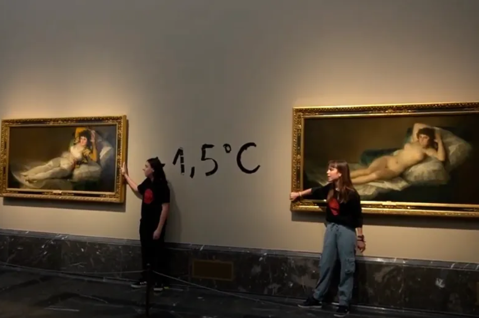 Los activistas de la lucha contra el cambio climático se pegaron el sábado a los marcos de dos cuadros mundialmente conocidos del maestro español Francisco de Goya en el Museo del Prado de Madrid, la última de una serie de protestas contra obras de arte en toda Europa.