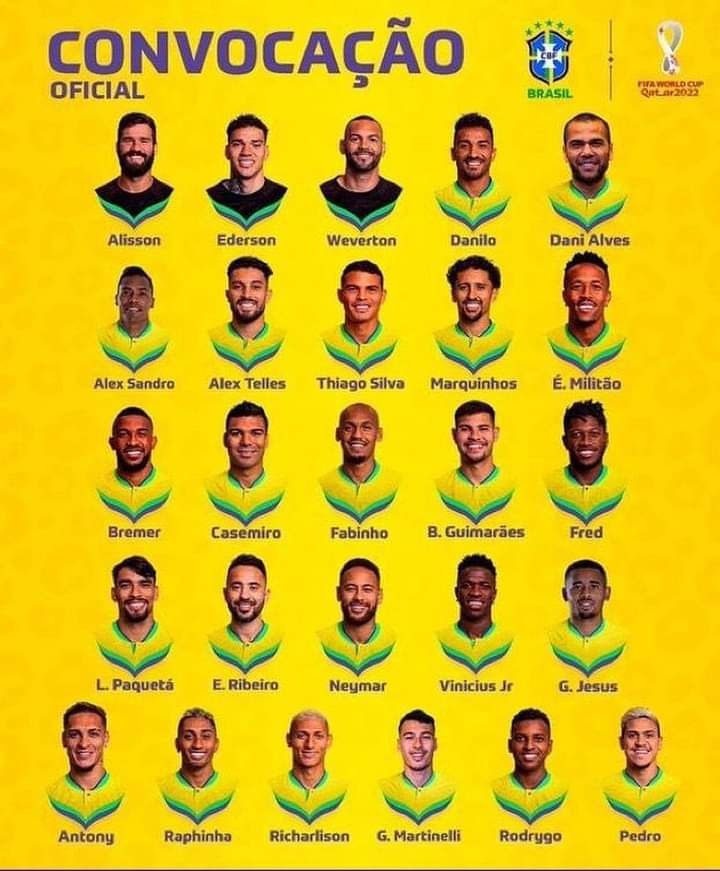 Delanteros: Neymar (PSG), Vinicius Junior, Rodrygo (Real Madrid), Richarlison (Tottenham), Raphinha (Barcelona), Gabriel Jesús (Arsenal), Antony (Manchester United), Gabriel Martinelli (Arsenal) y Pedro (Flamengo)