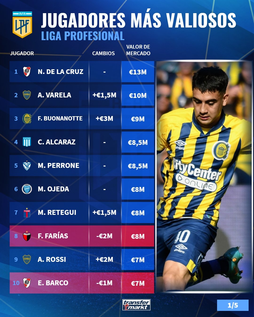 Siempre se dice que los jugadores valen lo que los clubes los terminan pagando, pero hay espacios que se dedican a llevar un análisis para luego, revelar cotizaciones. Es el caso del espacio de estadísticas y mercado Transfermarkt, en los últimos días elaboró un ranking de los jugadores más cotizados.