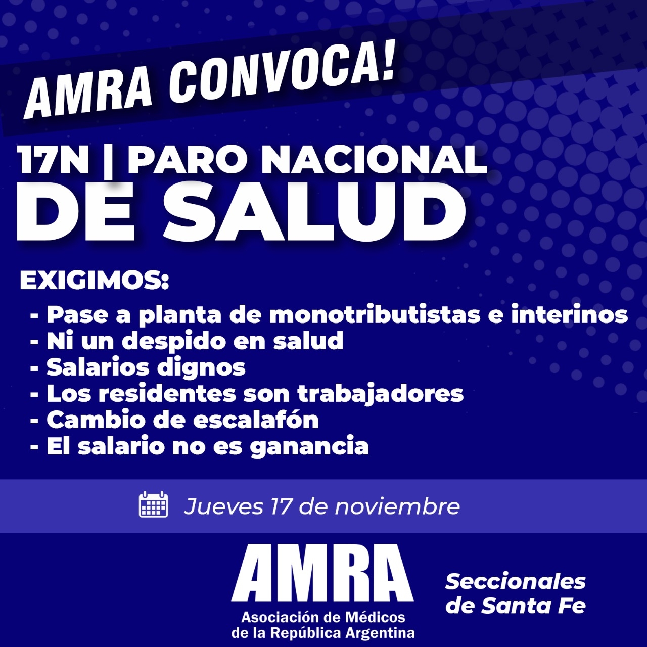 Dede AMRA Seccional Santa Fe, informaron que se adhieren al paro nacional de este jueves 17 de noviembre. Además de la medida de fuerza que será sin concurrencia a los lugares de trabajo y manteniendo las guardias mínimas y emergencias, habrá una concentración y movilización.