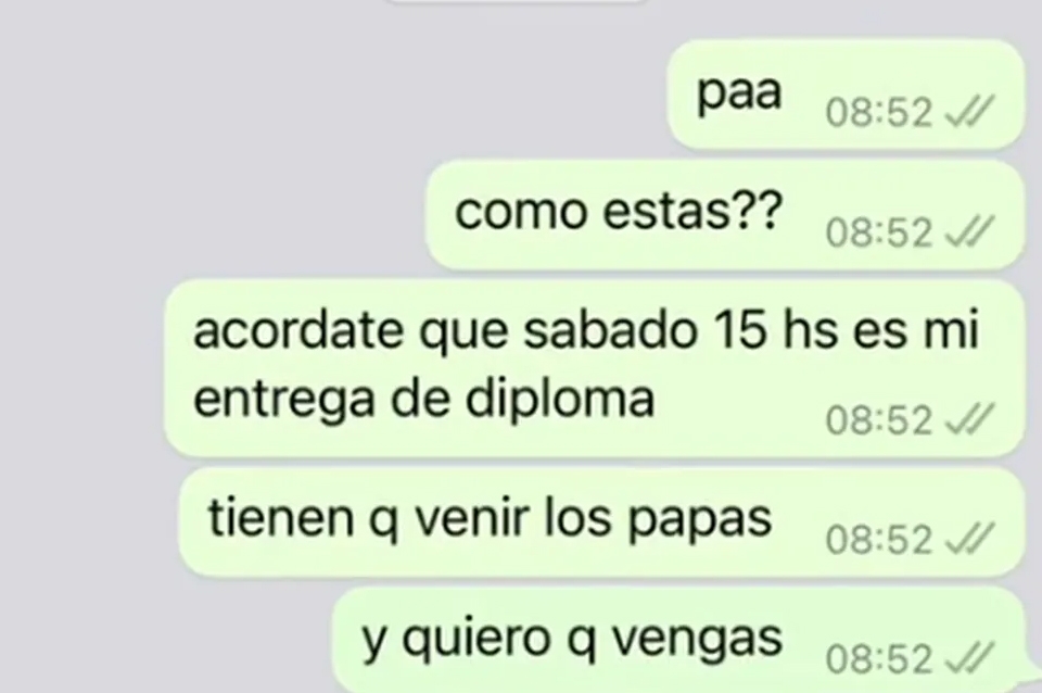 Su padre, sin sospechar que era una broma, fue cambiando de la sorpresa a la ira. Estaba confundido, preguntó si no se trataba de un error, pero Felicitas le aseguró que tenía dos actos de graduación y reventó: “Te pago el psicólogo, resolvelo ahí. No puedo ayudarte, posta”, sentenció el hombre, decidido a ver el partido decisivo en el último Mundial de Messi.