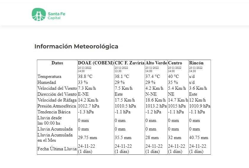 Además, a esa misma hora en el Cobem (zona terminal de ómnibus) hacían 38,8°C, en el CIC de Facundo Zuviría, 38,1°C, y en Alto Verde 37,4°C. Mientras tanto, en ningún sector de Santa Fe la humedad superaba el 35%.