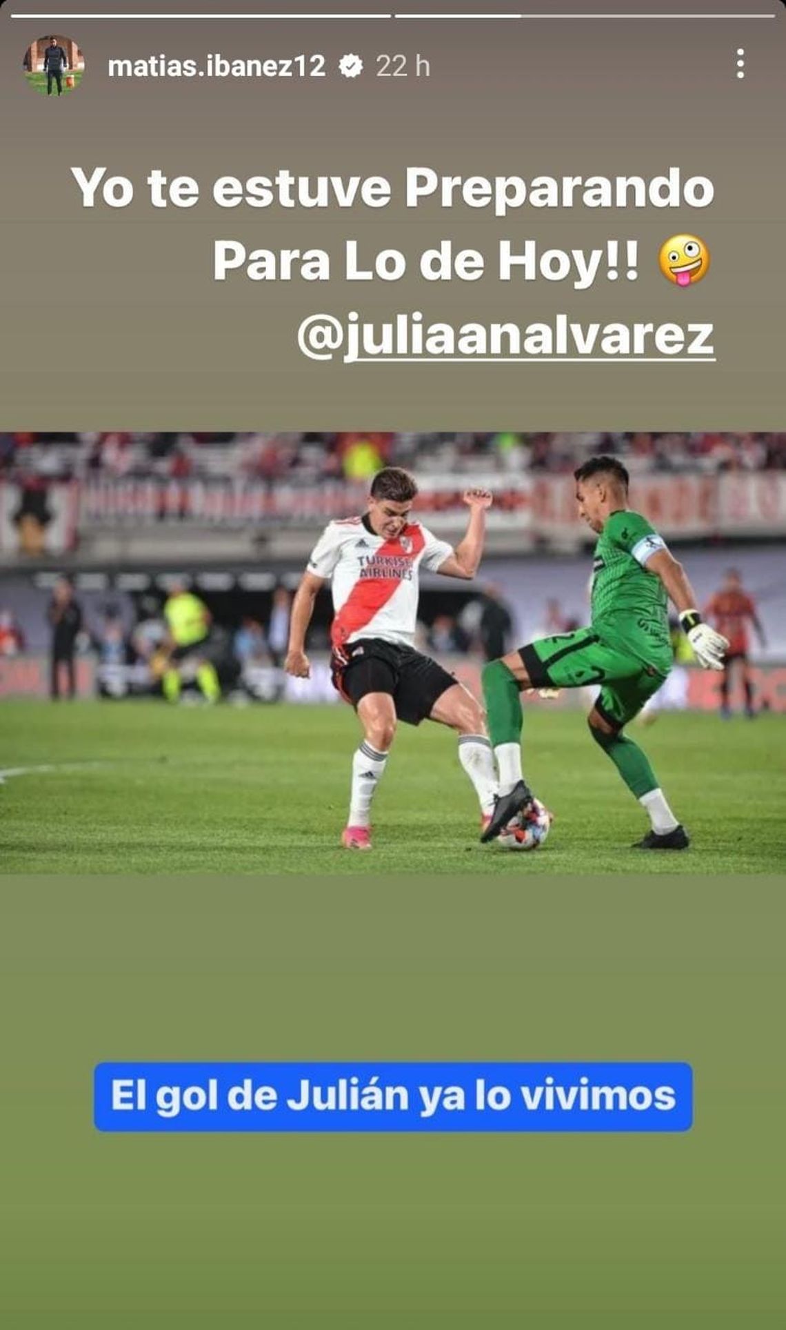 "Yo te estuve preparando para lo de hoy", comentó apenas un rato después del triunfo argentino Ibáñez, en una historia de Instagram, junto a una foto del momento del gol Millonario. "El gol de Julián ya lo vivimos", agregó el actual guardameta de Colón de Santa Fe, de 35 años.