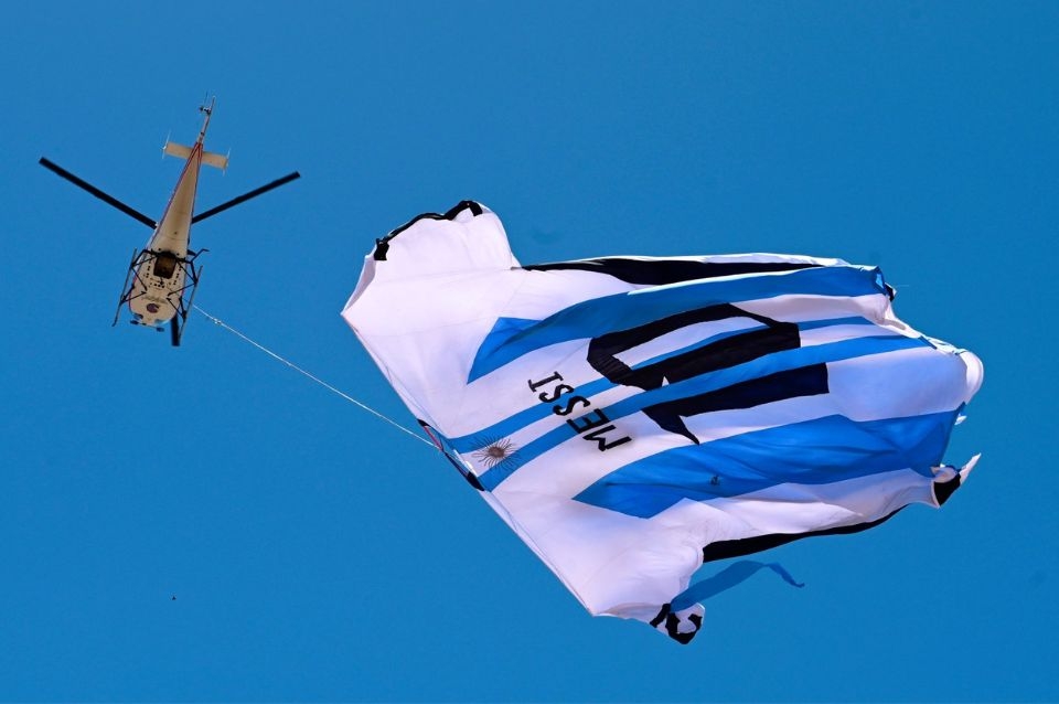 Una enorme camiseta celeste y blanca de Lionel Messi, catalogada como "la más grande del mundo", apareció este martes elevada por un helicóptero y flameando en el cielo de la costa de Rosario, en donde "La pulga" nació e hizo sus primeras gambetas, para alentar a la selección en la previa de la semifinal contra Croacia.