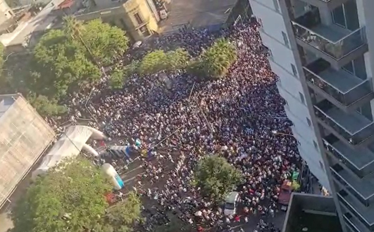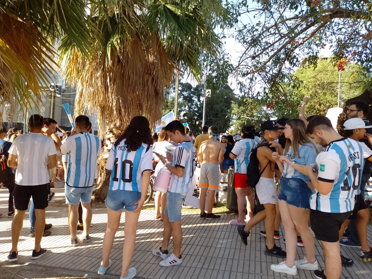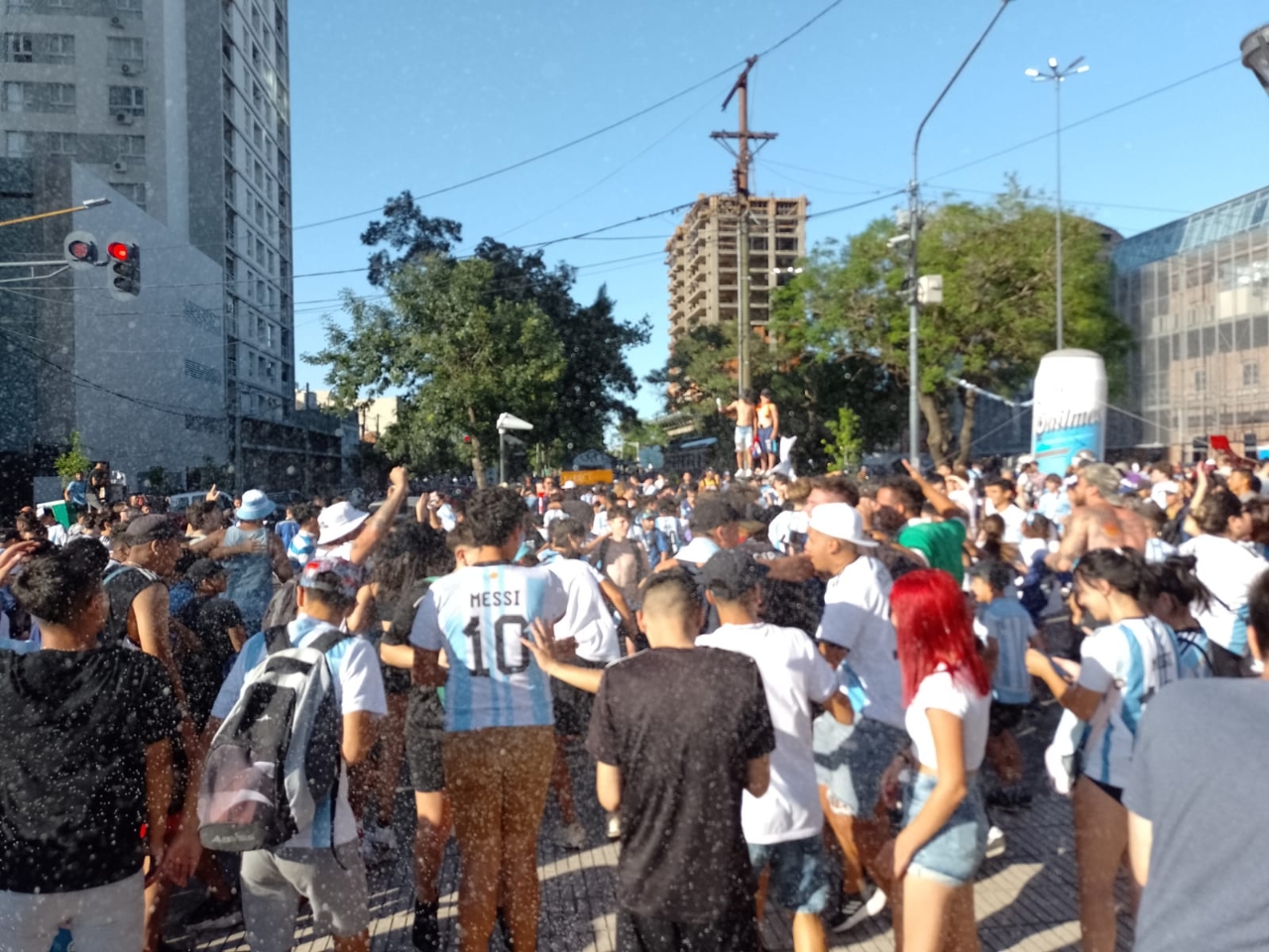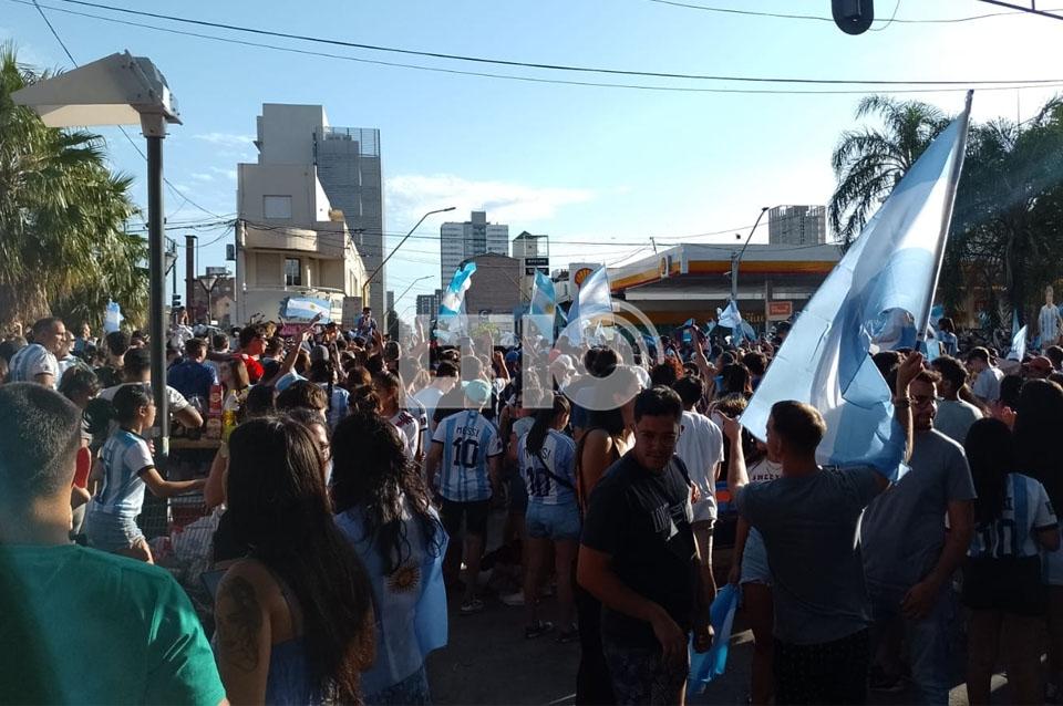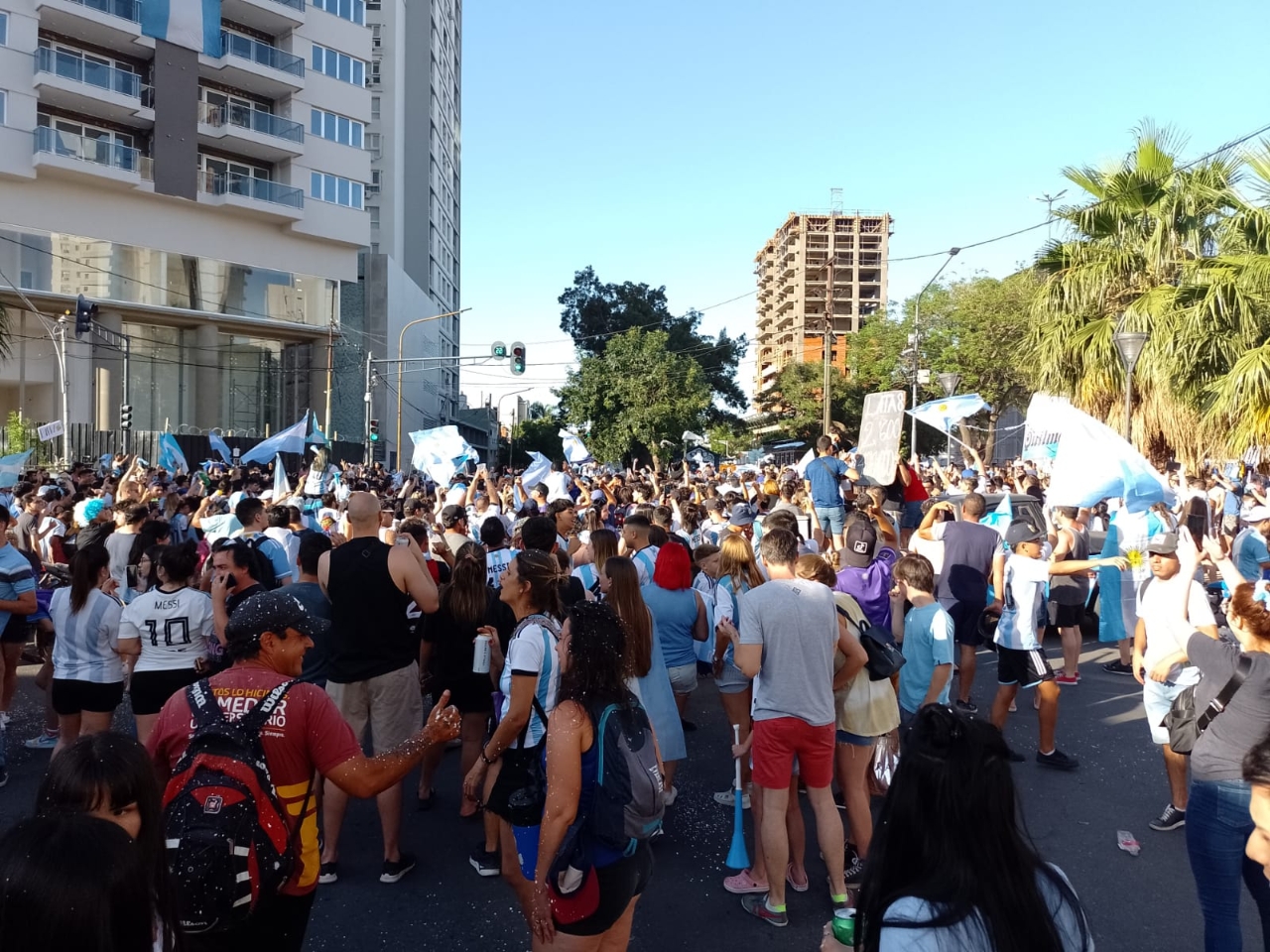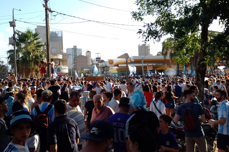 En la esquina de Rivadavia y Boulevard una multitud se acerca para festejar el triunfo del equipo de Messi y compañía.