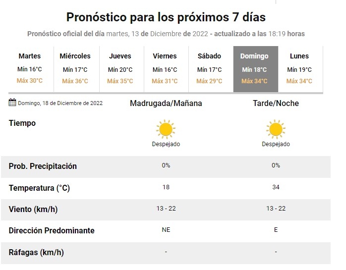 Todo un país espera que llegue el domingo para vivir una nueva fianal mundialista. Mientras Argentina espera rival, toda información es importante para llegar de la mejor manera. Según el pronóstico extendido del Servicio Meteorológico Nacional se espera una jornada a puro sol y calor para alentar.
