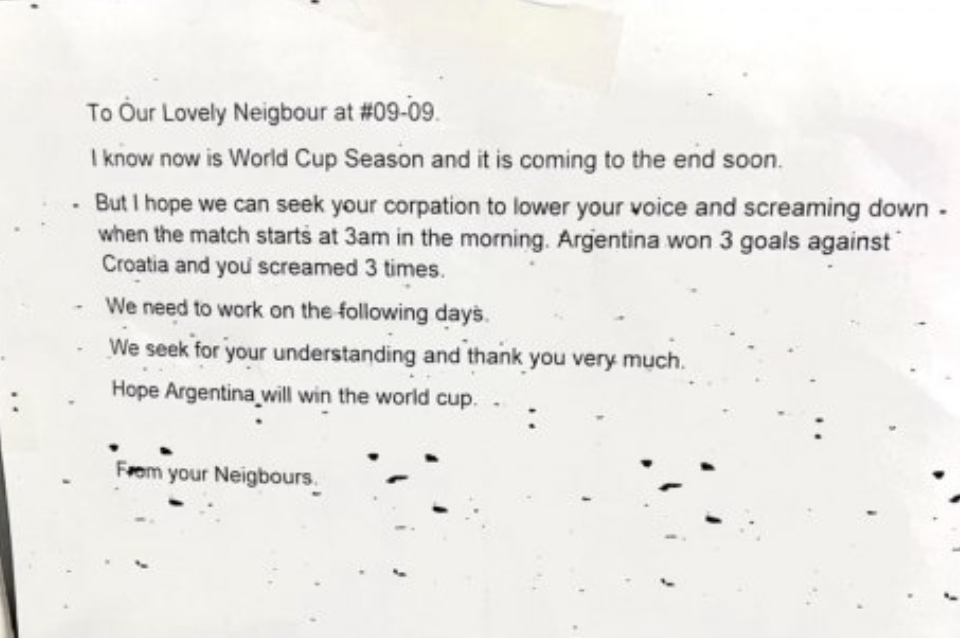 "Sabemos que es el Mundial y que está llegando a su fin pronto. Pero esperamos tu cooperación para bajar la voz y gritar más despacio cuando el partido empieza a las 3 de la mañana. Argentina ganó por tres goles contra Croacia y gritaste las tres veces. Tenemos que trabajar al otro día. Esperamos que sepas entenderlo y muchas gracias", reza el escrito -en inglés- con el que se encontró un argentino que reside en Singapur.