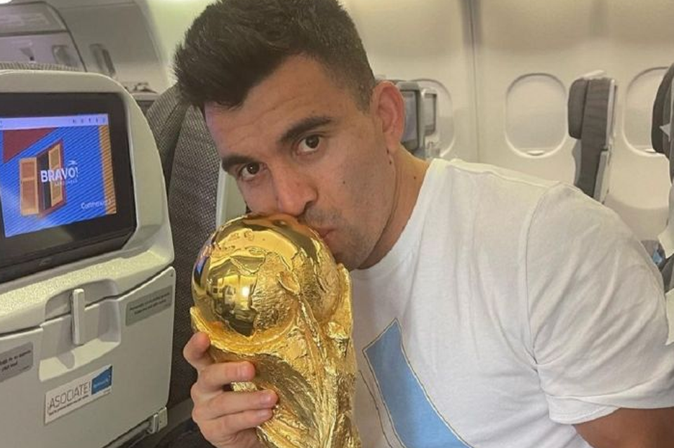 Además, el integrante del equipo conducido por Lionel Scaloni también se llevó de presente una camiseta de Ferro con su número y la leyenda "campeón del mundo". Más tarde, como siguiendo su trayectoria deportiva, se trasladó hasta Avellaneda, más precisamente al predio "Tita Mattiussi" de Racing.