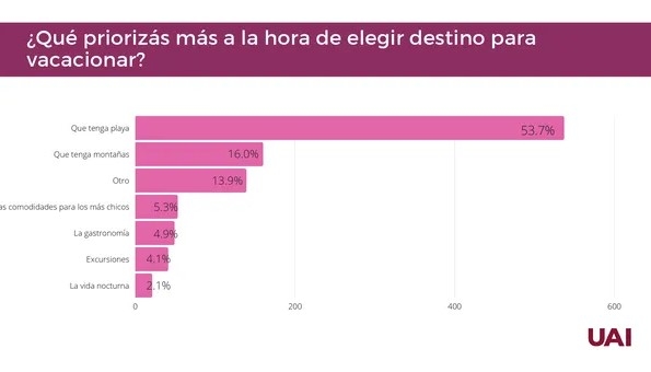 Por último en cuanto a las prioridades a la hora de elegir destino, la mayoría (53,7%) dijo que donde vacaciona debe tener playa. Lo siguieron: montañas (16%); comodidades para los más chicos (5,3%); buena gastronomía (4,9%); excursiones (4,1%), vida nocturna (2,1%) y otros (13,9%).