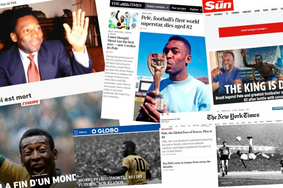 "Pelé, la primera superestrella mundial de fútbol, muere a los 82 años" anunció el diario The Times de Londres, Inglaterra.y The Sun: "El Rey está muerto. La leyenda brasileña Pelé y el mejor futbolista de todos los tiempos muere a los 82 años tras una batalla contra el cáncer".