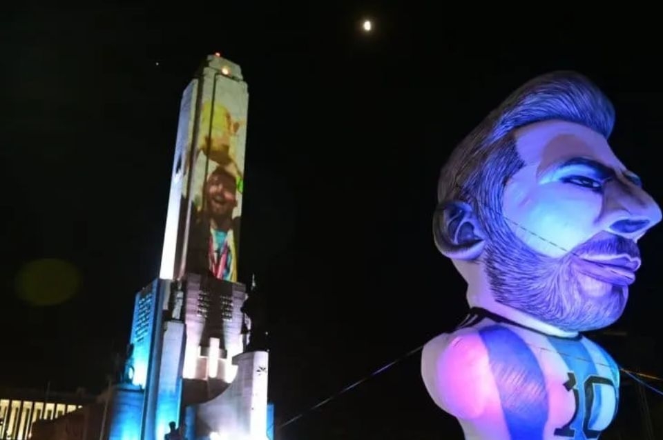 El municipio de Rosario realizó este viernes por la noche un espectáculo homenaje multimedia, de luces y sonidos, que incluyó la proyección sobre el Monumento Nacional a la Bandera de los futbolistas rosarinos campeones del mundo en Qatar 2022, Lionel Messi y Ángel Di María.