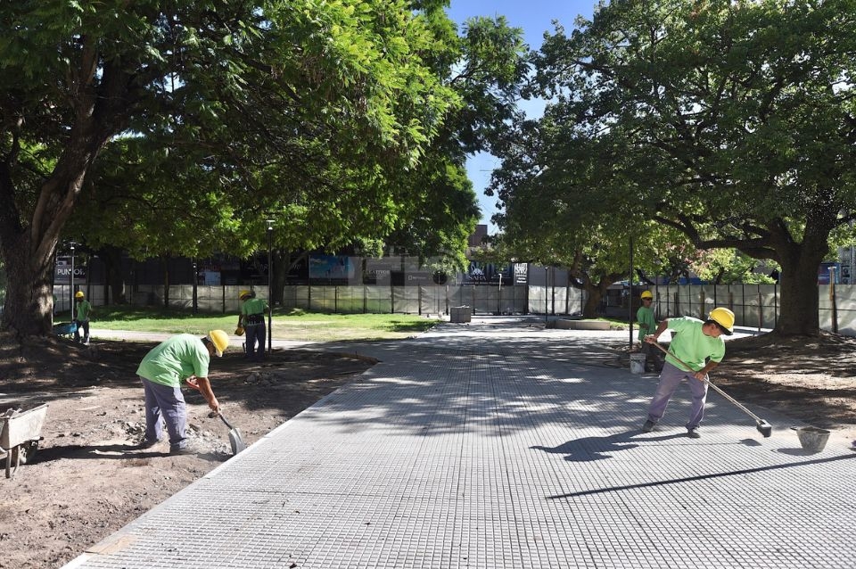 El cerco perimetral aún se mantiene pero ya se puede ver la unificación del piso a través de la incorporación de losetas graníticas antideslizantes y de alta resistencia. También, buena parte del mobiliario urbano que va a reemplazar al viejo ya está listo para ser colocado. En tanto, se concluyó con la puesta en valor del pasaje Bustamante.