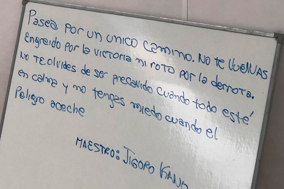 Frase de Jigoro Kano escrita en el pizarrón de la academia