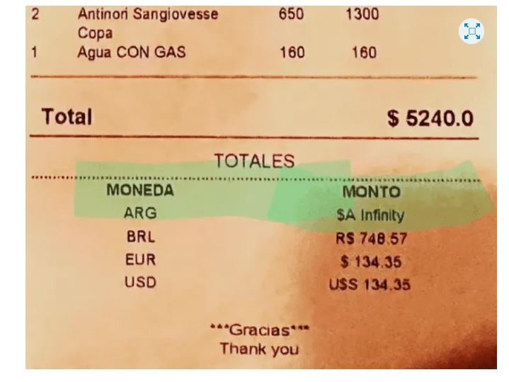 Todo comenzó en Twitter, donde un viajero que disfruta del país vecino reveló a sus seguidores la particular inscripción que detallaba el ticket sobre el cambio de moneda a pesos argentinos. Según indicaba la cuenta viral, el total a pagar era 5.240 pesos uruguayos. Mientras que en dólares, el gasto era U$S 134.35 y en reales 748.57. Sin embargo, al lado de la sigla AR se leía "$A Infinity".